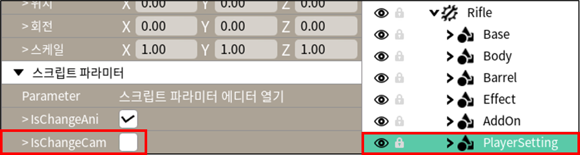* PlayerSetting : 총 장착 시 애니메이션/카메라 변경에 관한 그룹이에요.